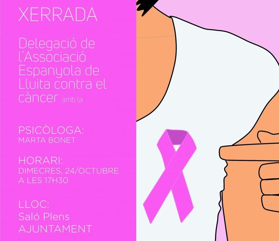 La delegació local de l'Associació de Lluita contra el Càncer de Santa Magdalena organitza demà dimecres, 24 d'octubre, a les 17.30 hores, una xarrada informativa, en el saló de plens de l'Ajuntament, que serà a càrrec de la psicòloga, Marta Bonet.