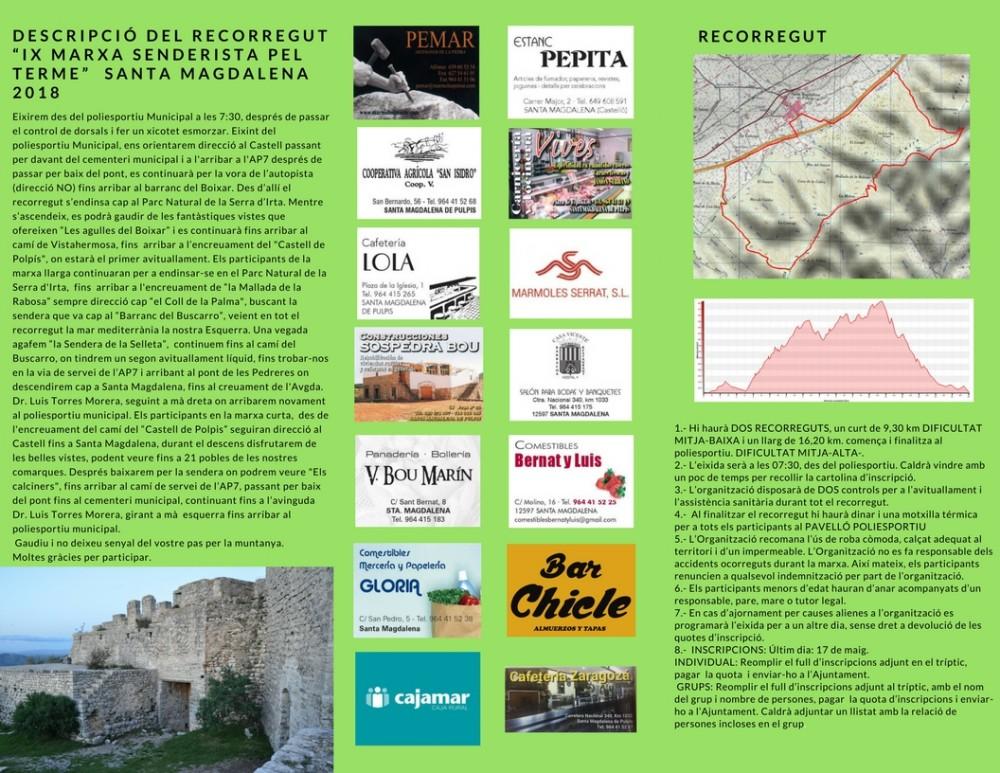 La regidoria d'Esports de l'Ajuntament de Santa Magdalena recorda que encara està obert el termini d'inscripció per a la IX Marxa Senderista pel terme, que tindrà lloc el pròxim 20 de maig i en la qual es preveu una participació, que superarà els 200 senderistes,  que recorreran alguns dels paratges més bells del Parc Natural de la Serra d´Irta.