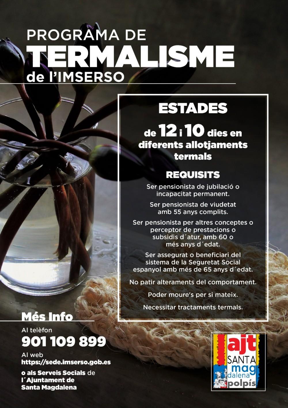 La Generalitat Valenciana ja ha obert el termini per a sol•licitar estades vacacionals dins del Programa de Termalisme 2020. Segons han detallat des del departament de Serveis Socials de l'Ajuntament de Santa Magdalena, aquest programa va dirigit a persones majors de 65 anys o amb discapacitat reconeguda.