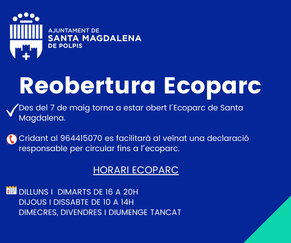 L'Ajuntament de Santa Magdalena informa que, a partir d´avui, s'obrin de nou tots els ecoparcs de la xarxa del Consorci de Residus C1, motiu pel qual el punt net de la localitat tornarà a obrir en el seu horari habitual.