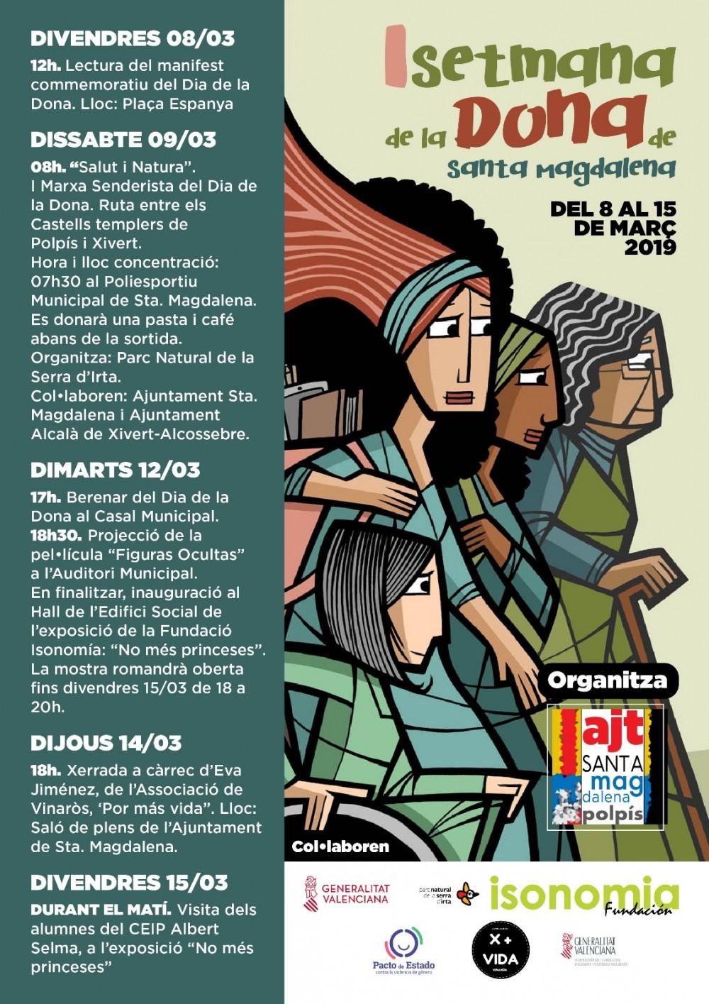 Los actos continuarán el sábado, 9 de marzo, con la I Marcha Senderista del Día de la Mujer. ‘Salut i Natura’, organizada por el Parc Natural de la Serra d´Irta, en colaboración con los Ayuntamientos de Sta. Magdalena y Alcalà de Xivert-Alcossebre. A las 7.30h tendrá lugar la concentración en el pabellón polideportivo de Sta. Magdalena, lugar en el que se realizará un pequeño desayuno. Los senderistas después partirán hacia el castillo Polpís y finalizarán su recorrido en el castillo Xivert, completando de este modo un recorrido de unos 18 kilómetros. La organización ha fletado un autobús, que estará esperando la llegada de los senderistas a Alcalà para devolverlos posteriormente al punto de partida, en Sta. Magdalena.
