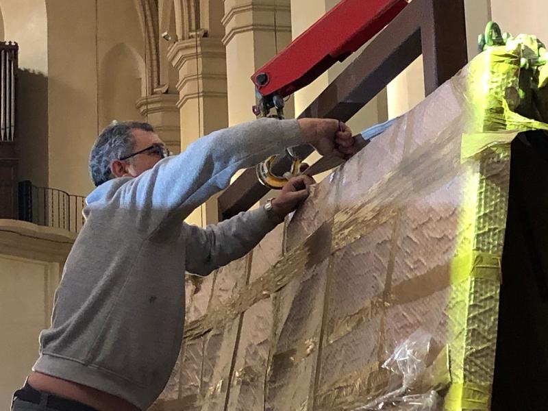 Los últimos lienzos llevaban por la mañana hasta la puerta de Santa María, embalados con cariño y completamente protegidos para ese último traslado, desde el taller hasta la concatedral.