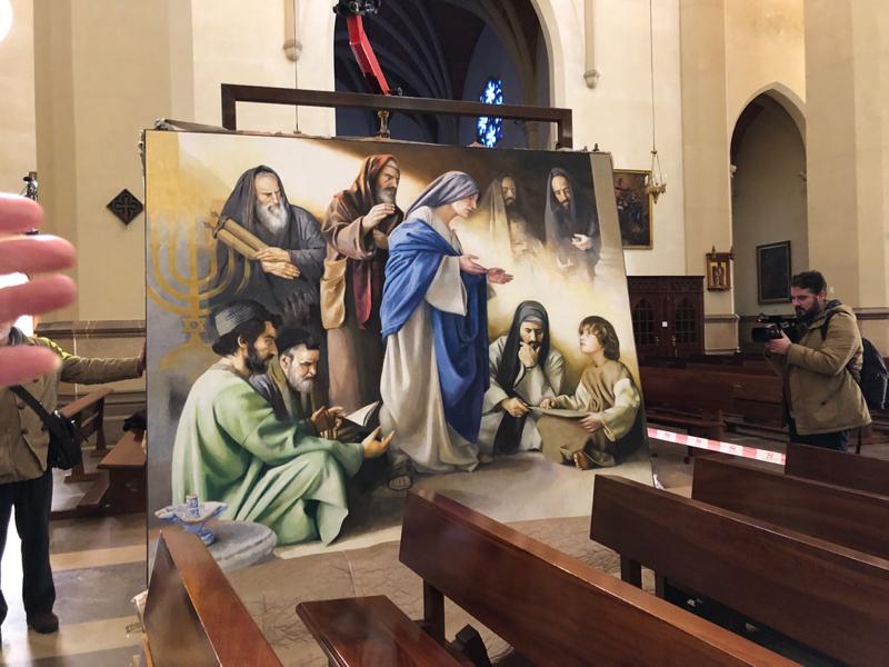 La concatedral de Santa María ya luce completo el cuadro pictórico del altar Mayor, donde se han instalado los dos nuevos cuadros pintados por el artista Traver Calzada. Dos composiciones magistrales, para las que se han necesitado dos años de trabajo, desde que el pintor trazara loa primeros bocetos hasta componer las imágenes: Las Bodas de Canaan, y Jesús en el templo. Con un mimo absoluto, las dos obras han sido colgadas a ambos lados del altar Mayor, mientras que el Cristo ha sido izado y ubicado en el lateral derecho, sobre un monolito de 2 toneladas de peso. Ambas obras han sido financiadas por la Diputación de Castellón, que editará un folleto en el que se relatará como se creó el conjunto pictórico.