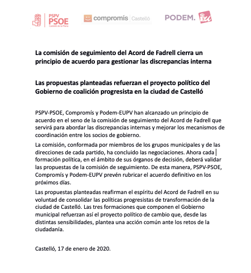 Las propuestas planteadas reafirman el espíritu del Acord de Fadrell en su voluntad de consolidar las políticas progresistas de transformación de la ciudad de Castelló. Las tres formaciones que componen el Gobierno municipal refuerzan así el proyecto político de cambio que, desde las distintas sensibilidades, plantea una acción común ante los retos de la ciudadanía”.