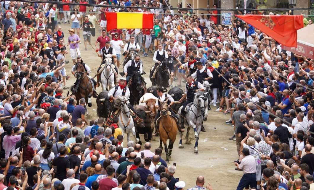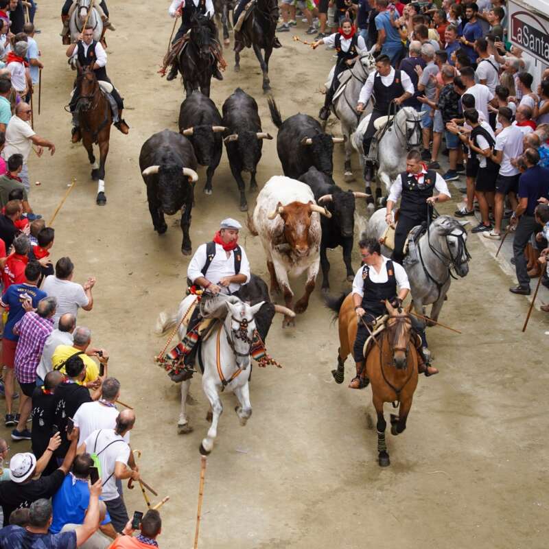 Con una duración de 50.55 segundos, los diez caballistas que han acompañado a los seis toros cerriles y al manso han sido: Manuel Zarzoso, Juan Antonio Calpe, Francisco Zarzoso, Patxi Guerrero, Carlos Guillén, Dani Palomar, Alfonso Alandí, Andrés Berbis, Esther Puchol y Nerea Alandía.