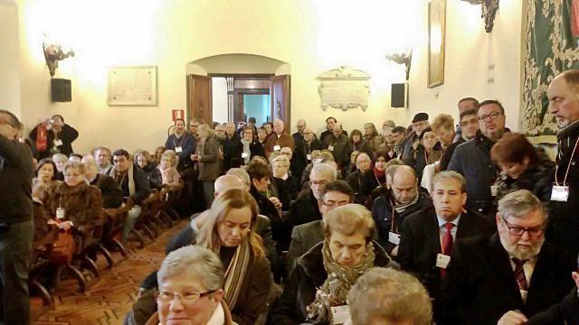 A continuación, los participantes del séptimo Encuentro Interdiocesano de Cofradías y Hermandades de Semana Santa de las tres diócesis de la Comunidad Valenciana, más de 250 personas, han sido recibidos por el Alcalde de Segorbe, Rafael Calvo y la Concejal de Participación Ciudadana, Soledad Santamaría en el Salón de Plenos del Ayuntamiento de la Capital del Palancia.
