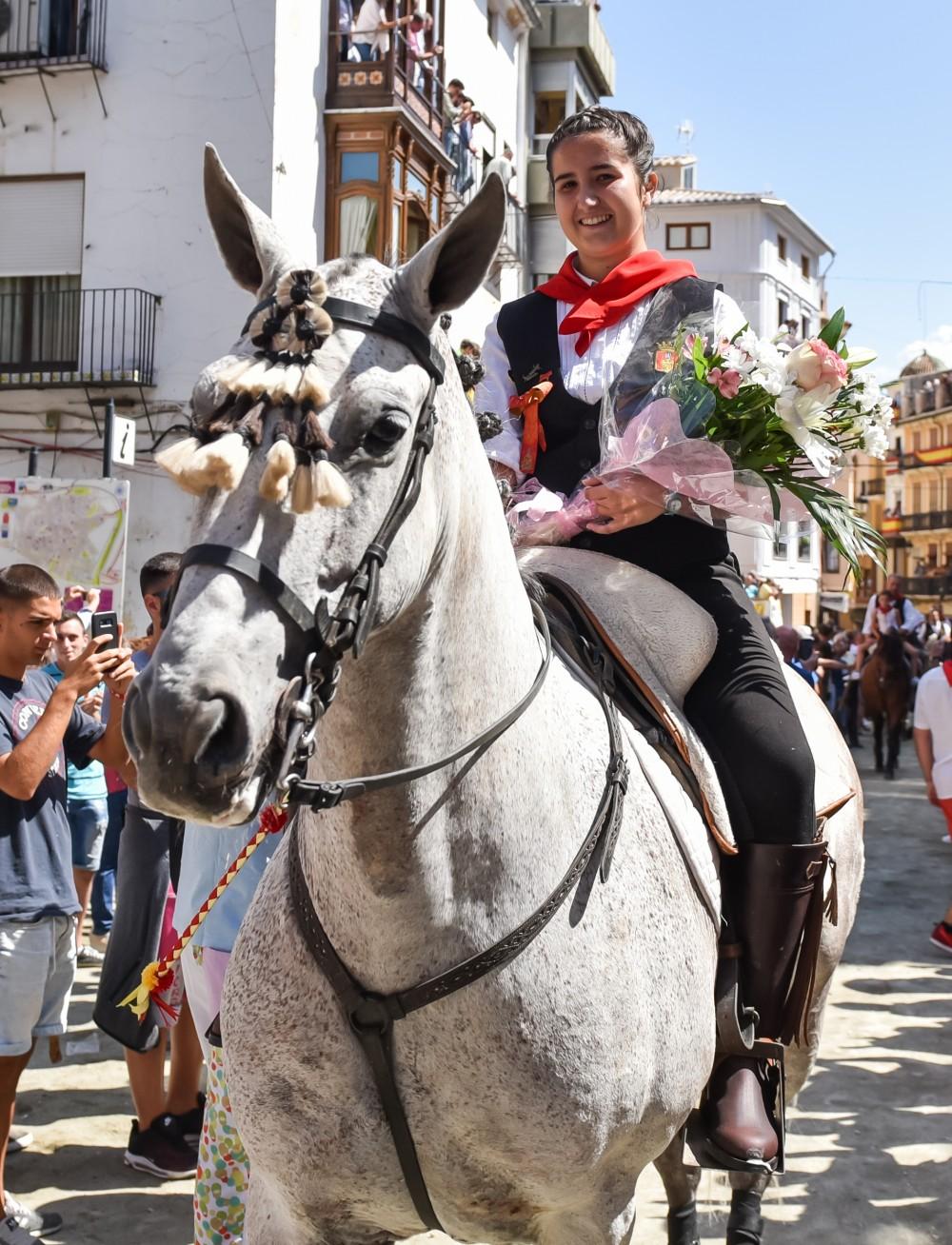 Dos mujeres han salido hoy en la Entrada de Toros y Caballos. Una veterana que ya cumple diez años como caballista, Esther P. Chiva, con su yegua Canela; y la incorporación más reciente al grupo, Nerea Alandí, con su caballo Hospitalario. Además, hoy también ha sido el día de debut de Dani Palomar, con su caballo Greco.