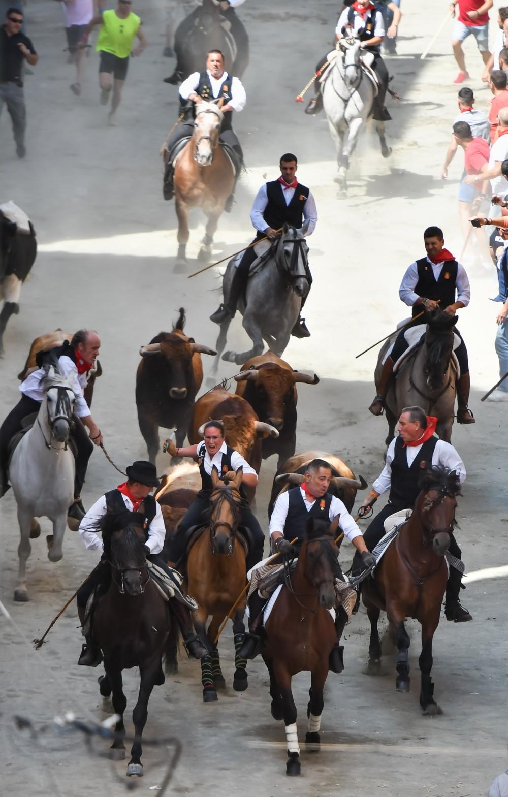 La segunda Entrada de Toros y Caballos ha transcurrido con total normalidad. Con una duración de un minuto y ocho segundos, catorce caballistas han acompañado a los seis toros y el manso en su recorrido por la calle Colón, de Segorbe.
