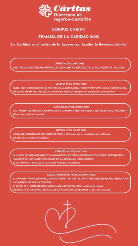 Y, por último, la Semana de la Caridad culminará los días 21 y 22 de junio, con las Eucaristías y Procesiones del Corpus Christi: el sábado en Castellón y el domingo en Segorbe.