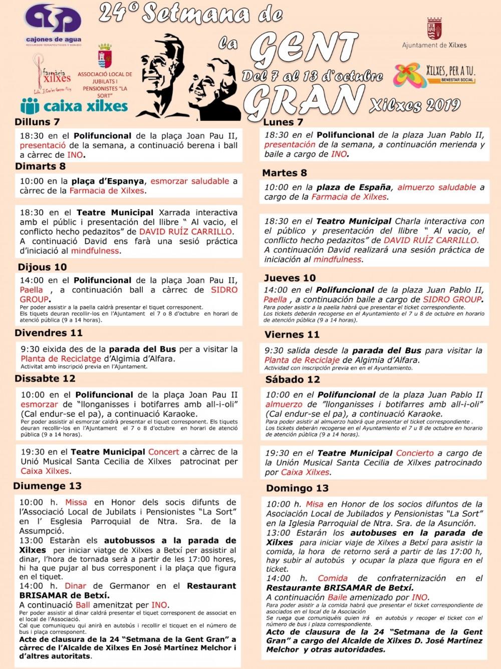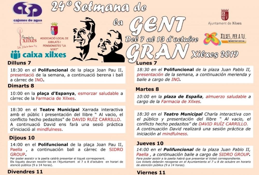 Xilxes celebrará la XXIV Semana de la Gente Mayor del 7 al 13 de octubre, evento organizado por el Ayuntamiento en coordinación con la Asociación de Jubilados y Pensionistas que pretende ofrecer unos días de descanso y diversión para los más mayores con propuestas lúdicas y saludables.