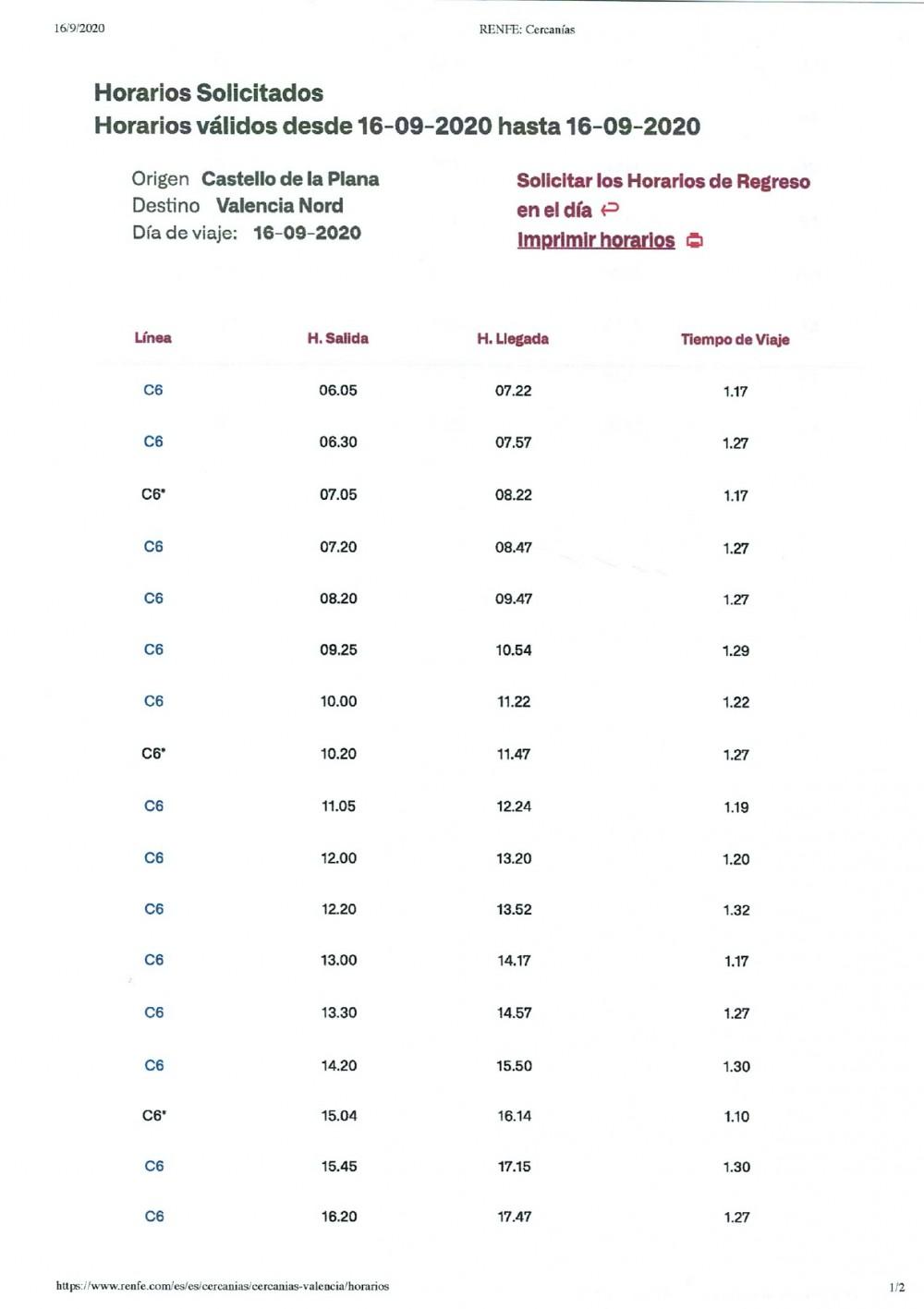 En consecuencia, cualquier persona que deba realizar un desplazamiento entre Valencia y Castellón por los motivos que sean, tendrá que emplear de tres horas y media a cuatro horas (aprox.), desglosadas de la siguiente forma: 80´ correspondientes a desplazamientos entre la estación y el domicilio (20´ hacia la estación; 20´ hasta el lugar de trabajo/estudio/gestión; 20´ vuelta a la estación; 20´ hasta el domicilio), más otra 2h y 50´correspondientes al trayecto en el tren.