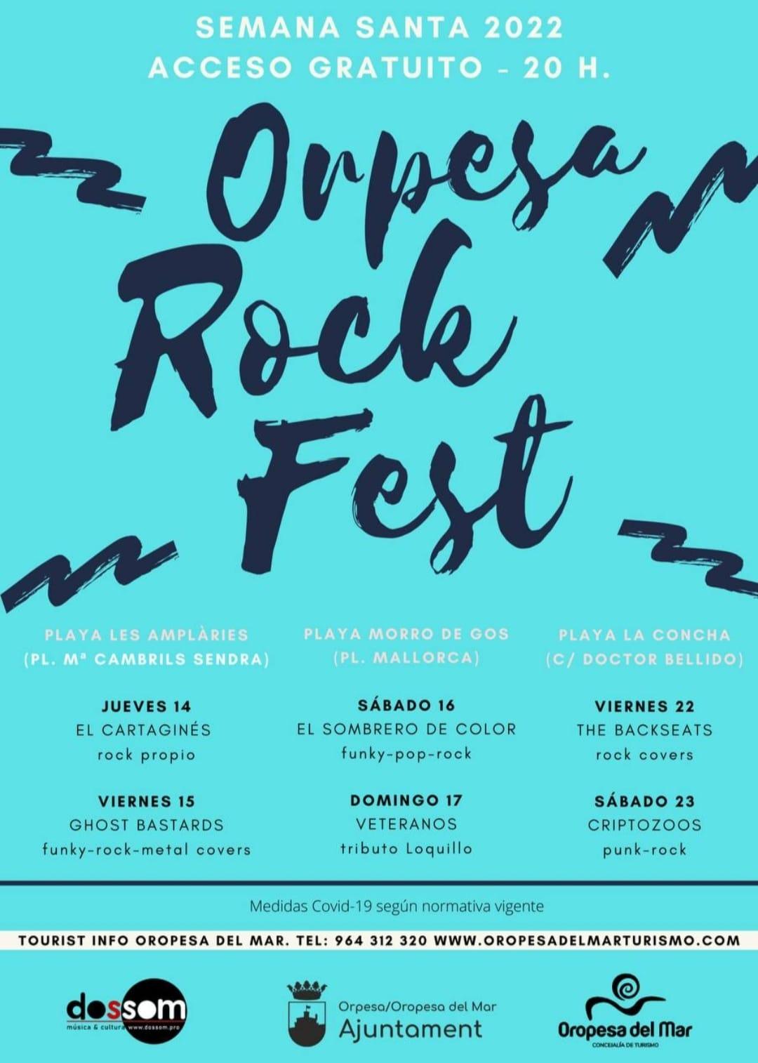 El Oropesa Rock Fest, llegará con su segunda edición con seis conciertos de grupos roqueros del entorno, con entrada completamente gratuita. Las actuaciones serán los días jueves y viernes santo y los dos fines de semana de Pascua. Las zonas elegidas son las principales playas de la localidad; dos conciertos en Morro de Gos, dos en Les Amplàries y otros dos en La Concha.