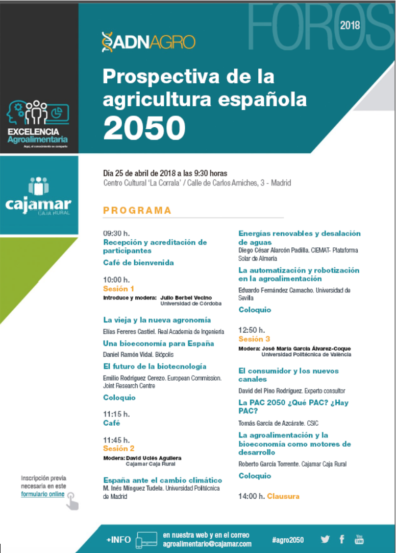 Cajamar Caja Rural reúne en el foro 'Prospectiva de la agricultura española 2050' a un grupo de expertos para reflexionar, analizar y debatir sobre algunos temas cruciales para el desarrollo futuro del sector agrícola; y colaborar en el diseño de actuaciones necesarias que contribuyan a redibujar el papel de nuestra agricultura en el medio plazo, de modo que pueda llegar a 2050 en las mejores condiciones de competitividad, calidad y seguridad alimentaria.