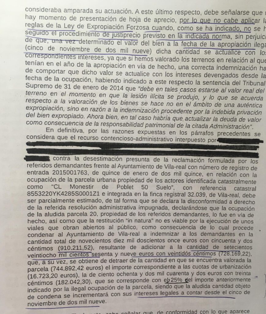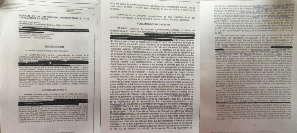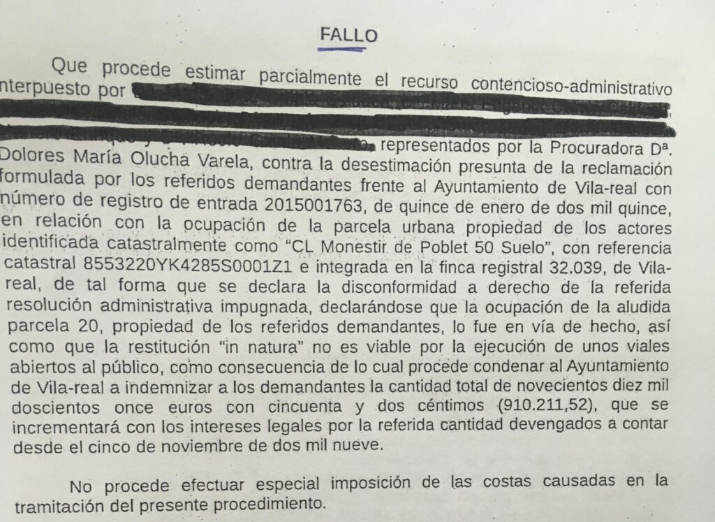 Vila-real ha rebut un nou revés judicial d’un cas desconegut fins al moment. La resolució del Jutjat Contenciós-Administratiu nº2 de Castelló condemna a la ciutat a pagar 910.211 euros i afecta uns terrenys ubicats en l’avinguda de França en l’eixida a Castelló. A aquesta quantitat se li podrien sumar al voltant de 300.000 euros més en concepte d'interessos generats des del 5 de novembre del 2009, moment en el qual es produeix l'ocupació dels terrenys als seus legítims propietaris, la qual cosa sumaria 1,2 milions en total. Aquest sòl ser ‘ocupat de forma il·legítima’, com esmenta la sentència, i va permetre la connexió d'aquest vial amb la N-340, després d’anys de reivindicacions dels veïns de l’avinguda Riu Ebre pel gran trànsit que travessava aquest vial per a dirigir-se a Castelló.