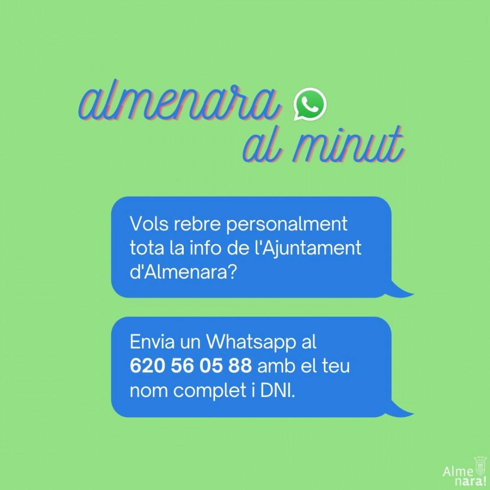 Les persones interessades a rebre a través d'aquest sistema els comunicats remesos des de l'Ajuntament d'Almenara hauran de realitzar una sol·licitud enviant un WhatsApp al telèfon 620 56 05 88 amb el nom complet i el DNI.