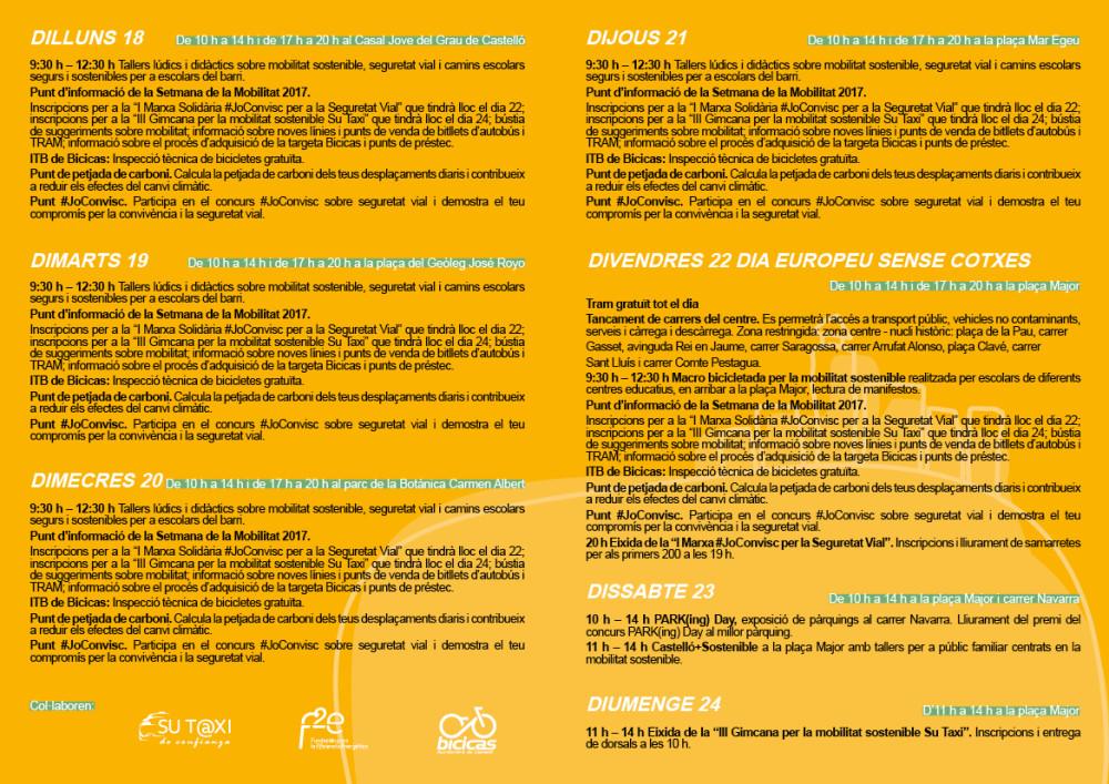 Més espais urbans i més pensada per al públic infantil. Així és enguany la Setmana Europea de la Mobilitat amb la qual l'Ajuntament de Castelló se suma a aquesta campanya internacional per a conscienciar sobre la mobilitat sostenible. La programació inclou de dilluns a divendres, en horari de matí i vesprada, tallers lúdics i didàctics sobre mobilitat sostenible, seguretat vial i camins escolars. A més, també hi haurà una calculadora de petjada de carboni que permetrà conèixer l'impacte dels desplaçaments urbans que es fan diàriament.