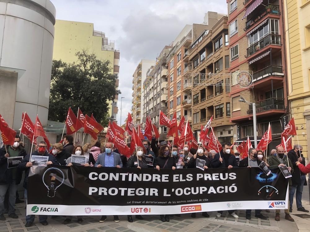 Esta mañana los sindicatos UGT y CCOO de la provincia de Castellón han salido a protestar a las calles en una concentración en la plaza de las Aulas en Castelló de la Plana por la subida “desorbitada” de los precios de la energía. La luz, el combustible y el gas han aumentado su coste hasta precios récord en los últimos días y ya son más colectivos los que comienzan a alzar la voz en busca de medidas.