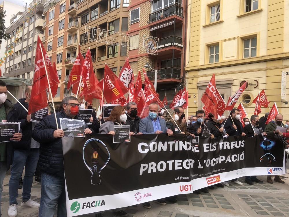 En la plaza de les Aules de Castelló UGT y CCOO han convocado una concentración esta mañana por la subida "desorbitada" del precio de la luz, el gas y el combustible. Desde los sindicatos demandan medidas urgentes que protejan a los autónomos y a las pymes, que están siendo los más afectados. Estos colectivos también han hecho hincapié en la preocupante subida de la inflación y el aumento de trabajadores en situación de ERTE.