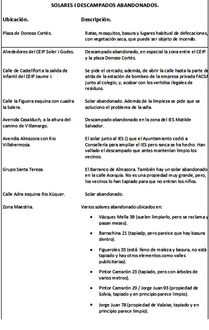 Las quejas que reciben los municipalistas, según relata la edil Anna Peñalver, han sido numerosas. “En las Juntas y Consejos de Distrito, o por las redes sociales, son constantes las demandas formales para que el Ayuntamiento intervenga” ha declarado Peñalver, para añadir a continuación “nos consta que diferentes vecinos y vecinas se han dirigido por escrito al Ayuntamiento exigiendo una solución a solares y descampados concretos sin tener respuesta”. De hecho, la agrupación ciudadana ha entregado en la comisión una relación de propiedades sobre las cuales hay demandas concretas.