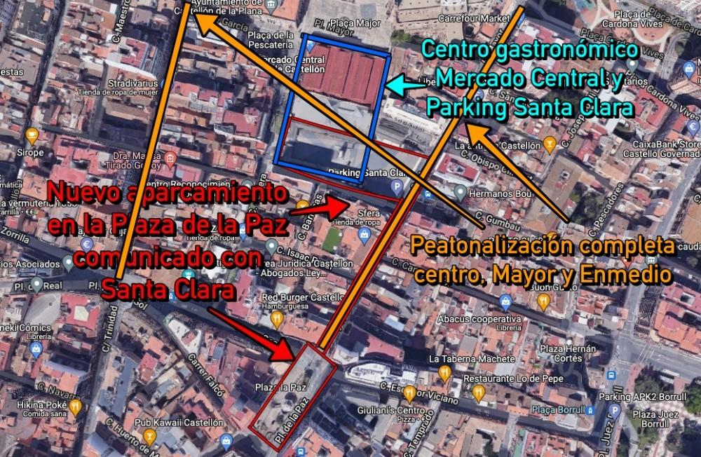 Som Castelló ha propuesto un Plan Maestro para dinamizar centro de Castelló a través del comercio y la gastronomía. Entre los puntos fundamentales, un aparcamiento subterráneo en Plaza de la Paz, comunicado por debajo de la calle Mayor con Santa Clara. La transformación del Mercado Central, comunicado con la Plaza Santa Clara, y la creación de un centro comercial y gastronómico en la primera planta de Santa Clara. Eso si, Enmedio y Mayor peatonales, desarrollo de terrazas y wifi gratis.