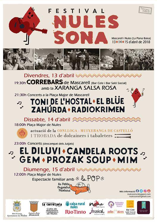 El III Festival Nules Sona es tancarà diumenge 15 d’abril amb un espectable familiar protagonitzat pel grup “La pop”, “aquest festival va començar amb una actuació i ara dos anys després veiem que són tres dies amb una programació plena de concerts i actes culturals valencians, en els quals Nules acull a molts visitants que es desplacen des de diferents punts del territori valencià”, conclou el regidor de Participació Ciutadana, Jaume Segura.
