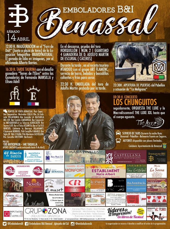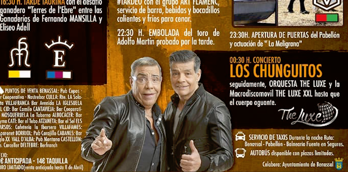 Chunguitos en Benassal que tendrá lugar el sábado 14 de abril. La fecha para adquirir las entradas anticipadas a 10 euros finaliza el próximo domingo, 8 de abril.