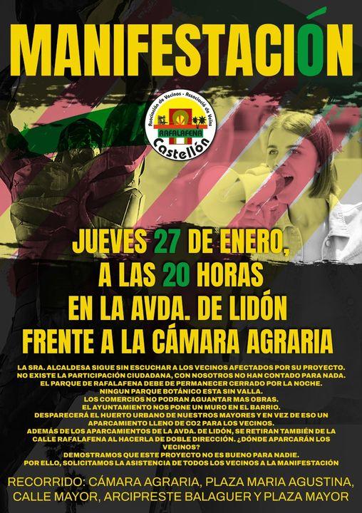 Los vecinos de la avenida de Lidón, habían convocado una manifestación para el próximo jueves, 27 de enero, a las 20:00 horas, frente a la Cámara Agraria, para protestar por las obras de remodelación del vial que pretende llevar a cabo el ayuntamiento de Castelló.