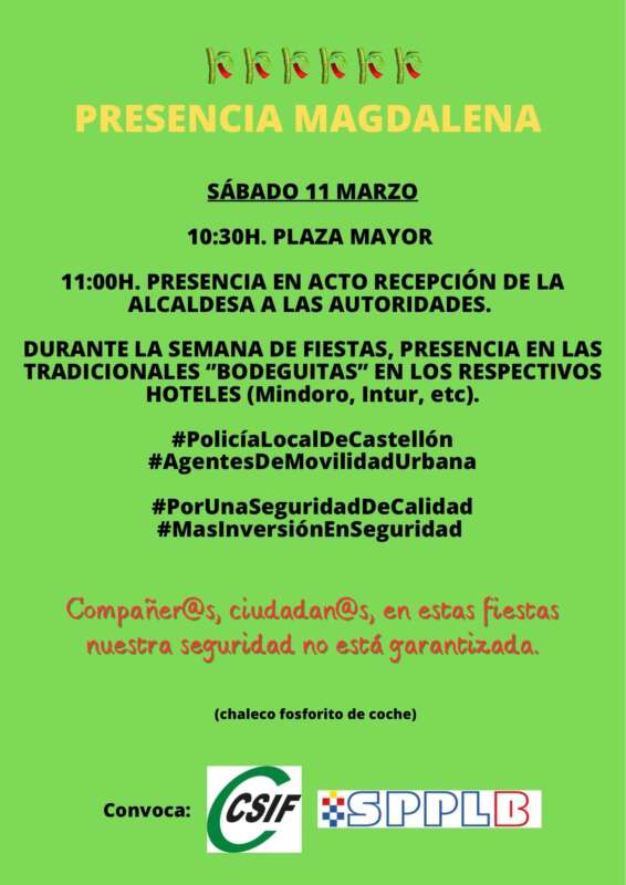 La subdelegación de Gobierno ha prohibido la manifestación de protesta de los agentes de la Policía Local de Castelló, convocada para mañana a las 10:30 horas en la plaza Mayor. Estaba convocada por los sindicatos Csif y Spplb para protestar “porque en estas fiestas la seguridad no está garantizada”