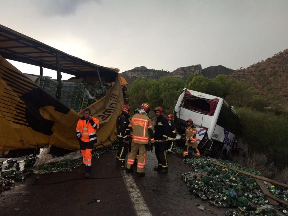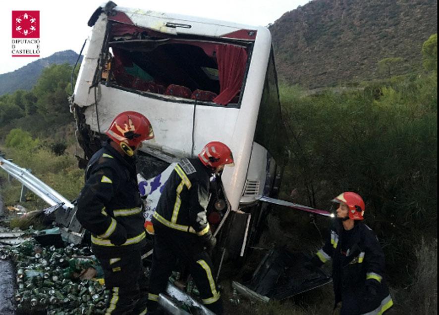 En el siniestro han estado implicados un autobús de turistas y un camión que transportaba Cerveza. En el momento del incidente, Benicassim soportaba una tormenta eléctrica, con cielos totalmente negros, acompañada por lluvia. El autobús ha caído por el terraplén.