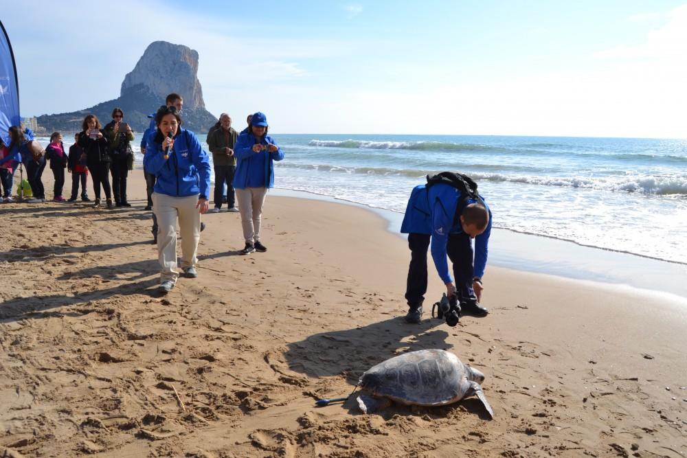 La tortuga ha sido devuelta a su medio natural con un emisor incorporado a su caparazón que permitirá a los expertos de la Fundación Oceanogràfic recopilar datos sobre sus movimientos.