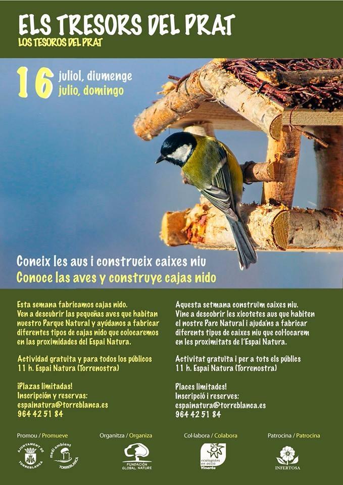 La Concejalía de Medio Ambiente ha organizado el Taller 'Conoce las aves y construye cajas nido', una actividad gratuita que tendrá lugar en el Espai Natura de Torrenostra este domingo 16 de julio.