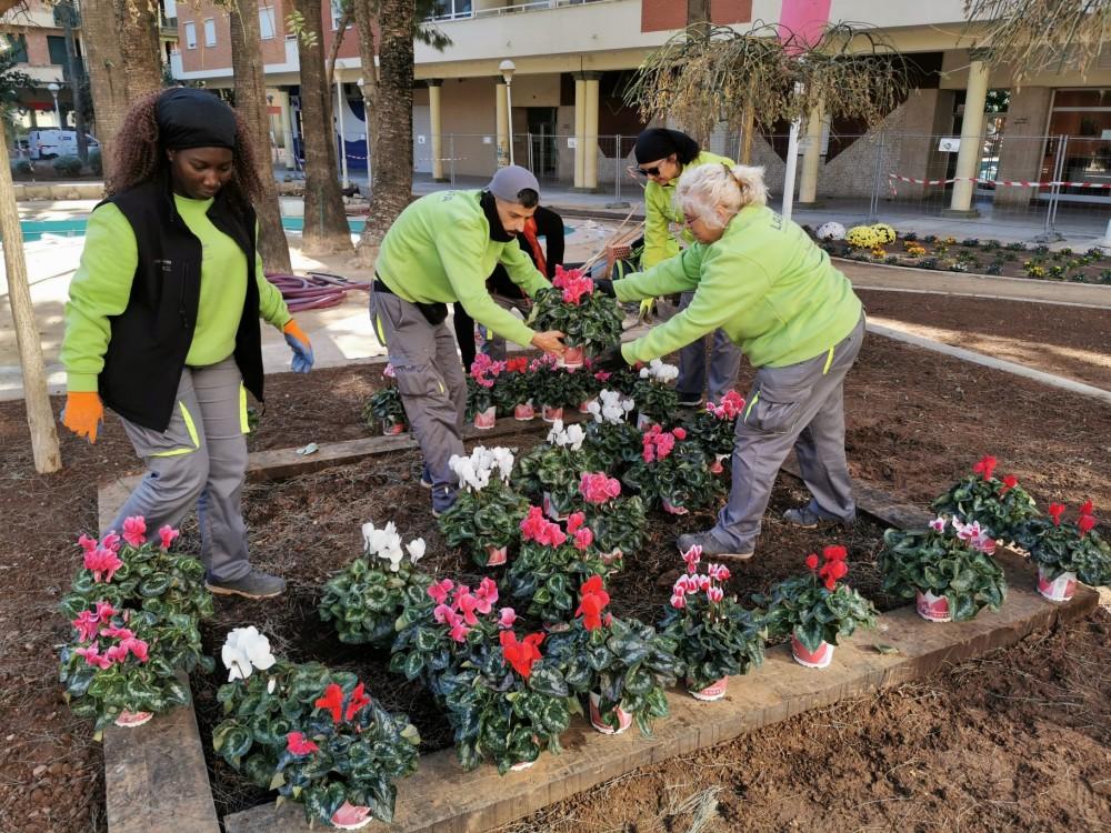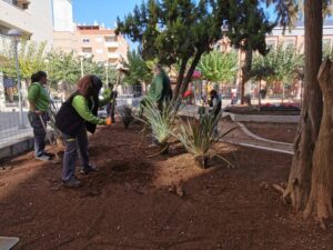 L'alumnat del taller d'ocupació ha començat els treballs de jardineria a la plaça de la Comunitat Valenciana, en una actuació que s'emmarca dins de la reforma integral de l'espai que du a terme la Regidoria de Medi Ambient. En concret, estan realitzant des de la preparació del terreny fins a l'abonament i la plantació de gespa i de diversos tipus de plantes i arbres. A més, també revisen els sistemes de reg i preparen una rocalla de plantes aromàtiques.