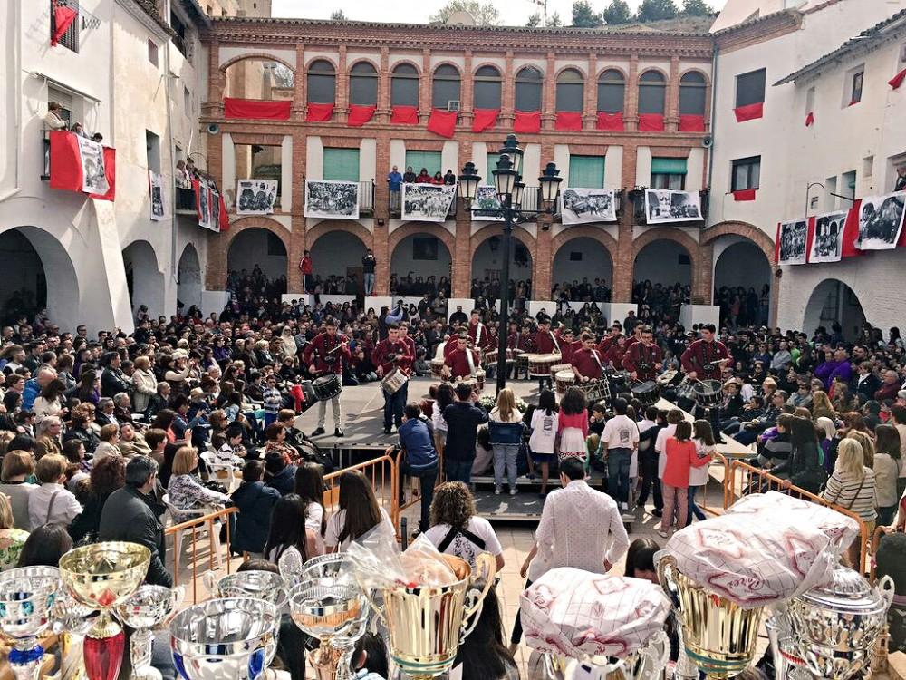 Aquest matí, com cada Diumenge de Ramos, Damián Aguilella dirigeix a les quadrilles en categoria infantil, juvenil i absoluta sobre l'entarimat de la plaça d'Espanya de Híjar. El ritme i la precisió de tots els components tornen a ser clau perquè la secció de tambors i bombos de la Germanor del Santíssim Crist del Calvari d'Almassora recupere la victòria en el 52 aniversari del certamen nacional.