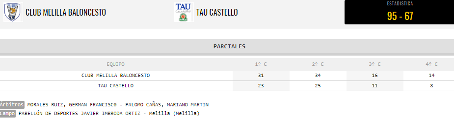 Empezó el tercer cuarto con el TAU Castelló mejor plantado en defensa y con las ideas más claras en ataque y con un parcial de 2-7 se acercaba en el marcador (51-41), pero los locales devolvieron el parcial y con un 10-2 conseguían su máxima ventaja (61-43). Ten pidió su primer tiempo del tercer cuarto. Pero los árbitros no ayudaban y no pitaban faltas en la zona melillense y esto desquiciaba a los jugadores del TAU Castelló. A partir de ahí un recital de triples del Melilla cerraba el tercer cuarto y casi el partido con (78-52). El último cuarto con el partido totalmente roto paso sin pena ni gloria para dejar el marcador final en un 95-67 que le daba la primera victoria de la eliminatoria al Melilla.