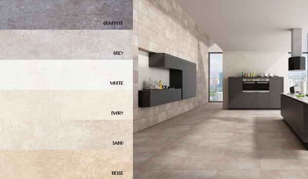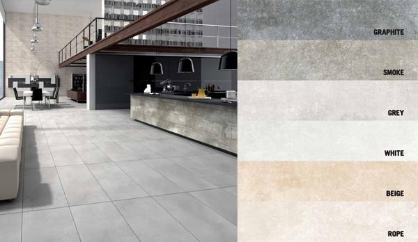 La colección Concrete se compone de los siguientes formatos: 45x90 cm., 22,5x90 cm., 60x60 cm., y 30x60 cm., y de los acabados Natural y Exterior. La paleta de colores se compone de: Graphite, Grey, White, Ivory, Sand y Beige.