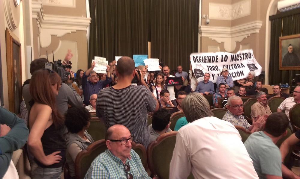 El público llenó el salón hasta la bandera. Y en la calle, muchos más, todos los que no pudieron acceder por falta de aforo. Unos y otros se dieron prisa por llegar antes, por copar los mejores puestos y por lucir sus pancartas. De hecho, ya estaban casi todos antes de que los concejales ocuparan sus escaños. Los pro taurinos exhibían una gran pancarta. Los anti taurinos, levantaron cartelitos; entre el público, personas con un cartel pegado al pecho.