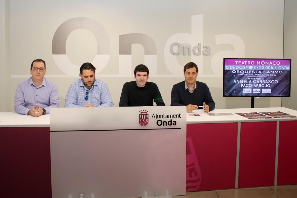 El Teatre Mònaco d'Onda rebrà el 15 de desembre el concert homenatge a Camilo Sesto ‘Quererte a ti’, de l'orquestra simfònica SAMVO, i el 16 de desembre la presentació del disc ‘Nosaltres’ d'Onda Big Band. Així ho ha anunciat Lluís Pastor, tinent d'alcalde de Cultura, juntament amb José Antonio Cavero, director de l'orquestra simfònica SAMVO; Jorge Calpe, director d'Onda Big Band; i David Zurriaga de Infinity. Lluís Pastor ha afirmat que “serà un cap de setmana de gran qualitat musical, amb actuacions que atrauran tant als onders com a visitants d'altres municipis, diversificant l'oferta cultural de la ciutat”.