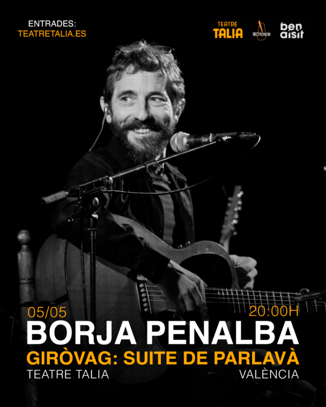 El cantautor Borja Penalba presentará en el Teatro Talía de Valencia su segundo proyecto en solitario, Giròvag: Suite de Parlavà. El concierto tendrá lugar el próximo martes 5 de mayo a las 20.00h. Penalba, acompañado por los músicos Vicent Colonques y Josep Zapater, interpretará canciones nuevas y antiguas en una noche llena de sorpresas y emociones. Para la ocasión, el músico se rodeará de un elenco de invitados muy especial: las cantantes Mireia Vives y Esther, así como sus hijos, Lucía Pelaba, bailarina, y Claudi, guitarrista del grupo Tenda, además de otras sorpresas que se descubrirán durante el concierto. Las entradas ya están disponibles desde 15 € en la web del Teatro Talía (consigue aquí tus entradas). También se pueden comprar en las taquillas por el mismo precio.