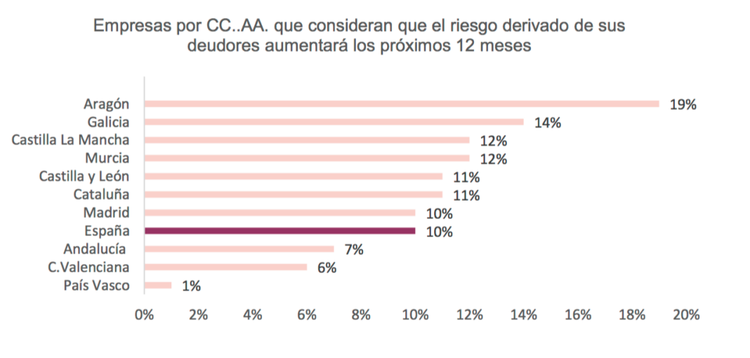 En el extremo opuesto, se encuentran las empresas aragonesas encabezando el ranking en lo que a pesimismo se refiere, pues el 19% de sus compañías cree que el riesgo derivado de sus deudores aumentará en los próximos 12 meses.