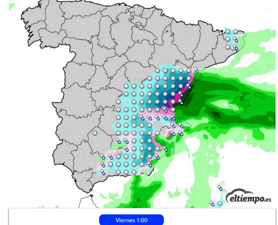 En el área mediterránea, la humedad marítima unida al frío, se traducirá en la proliferación de lluvia, aguanieve y nevadas, que se irán extendiendo a partir del jueves, de sur a norte, y que se intensificarían en la provincia de Castellón a partir de la noche del jueves. Serán importantes el viernes y comenzarían a retirarse el sábado. La situación de frío y nieve tendería a remitir completamente hacia el domingo.
