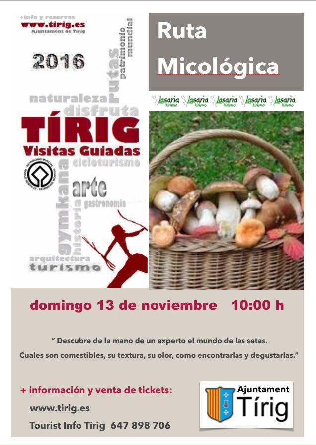 El próximo domingo 13 de noviembre, el Ayuntamiento de Tírig ha previsto realizar una ruta micológica por los alrededores del municipio. La visita guiada comenzará a las 10 horas de la mañana desde la plaza de la Generalitat y, de la mano de un experto, los asistentes podrán conocer las variedades de setas que crecen en el término municipal, su textura, olor y cómo recogerlas y degustarlas. El recorrido es apto para todo tipo de público y la organización recomienda llevar zapato cómodo o de montaña así como cesta para recoger las setas. El precio de la inscripción que se puede formalizar en la Oficina de Turismo es de cuatro euros para los adultos y dos euros para los niños.