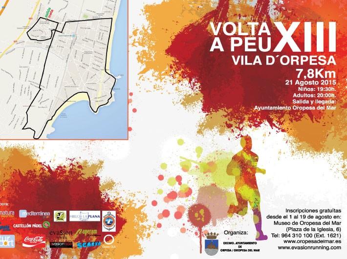 Un año más la Volta a Peu Vila d’Orpesa se consolida como una de las carreras populares más esperadas del municipio. Este año los inscritos superan el millar, aumentando de este modo los participantes respecto el pasado año. La prueba incluirá dos recorridos, uno para niños y otro de adultos. El recorrido para los más pequeños, que comenzará a las 19:30, va destinada a las edades de entre 5 y 12 años, y consiste en un circuito por las calles más céntricas del municipio de 1,100 metros. El recorrido para participantes adultos tiene una distancia de 7,800 metros, y comenzará a las 20:00, frente al Consistorio del municipio. Todos los participantes en la prueba serán obsequiados con una camiseta conmemorativa del evento.