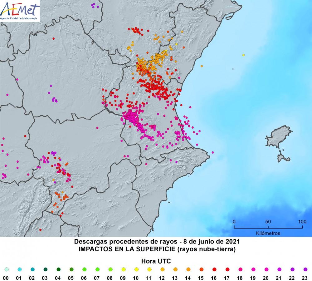 En estas poblaciones colindantes con la provincia de Valencia, se registraron 135 rayos, la gran mayoría de ellos cayeron sobre zonas de interior, según la información aportada por Aemet.
