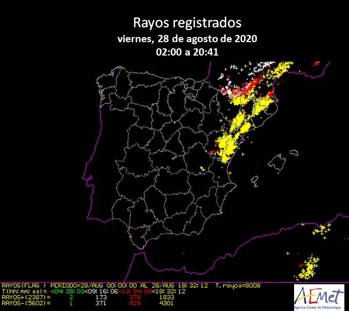 Pues bien, esta predicción se ha hecho realidad dejando fuertes precipitaciones en distintos puntos de la provincia acompañadas por importante aparato eléctrico. Y es que hasta las 20.30 horas se han registrado 6000 descargas procedentes de rayos registradas, 1536 han impactado en la provincia de Castellón.