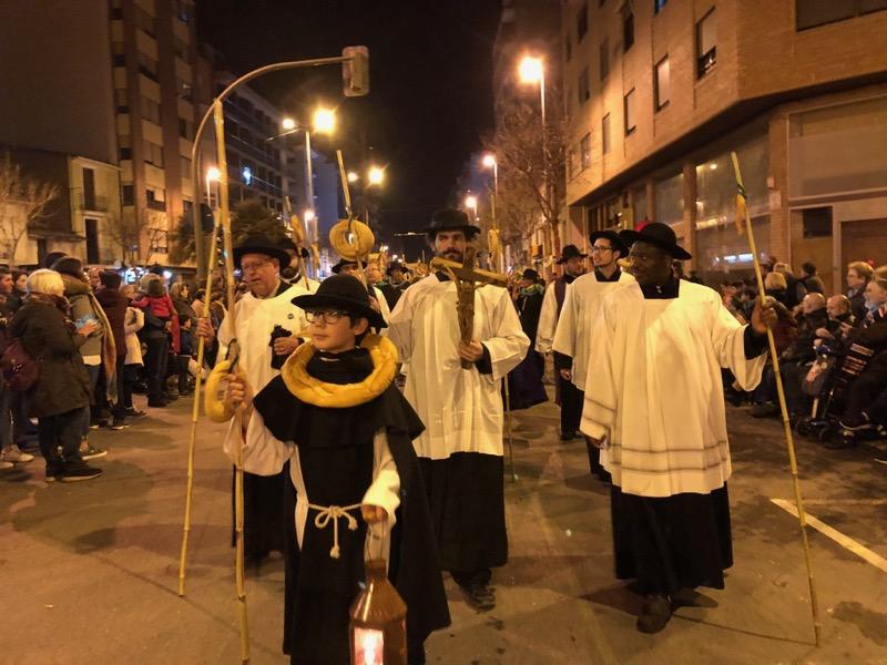 Tras los carros, entraba por la calle Sant Roc la Romería popular, encabezada por la parte religiosa de la Romería, los niños de las escolanías, la reliquia, y, tras ellos, los romeros ataviados con trajes tradicionales, cañas, ‘rotllos’ y faroles.