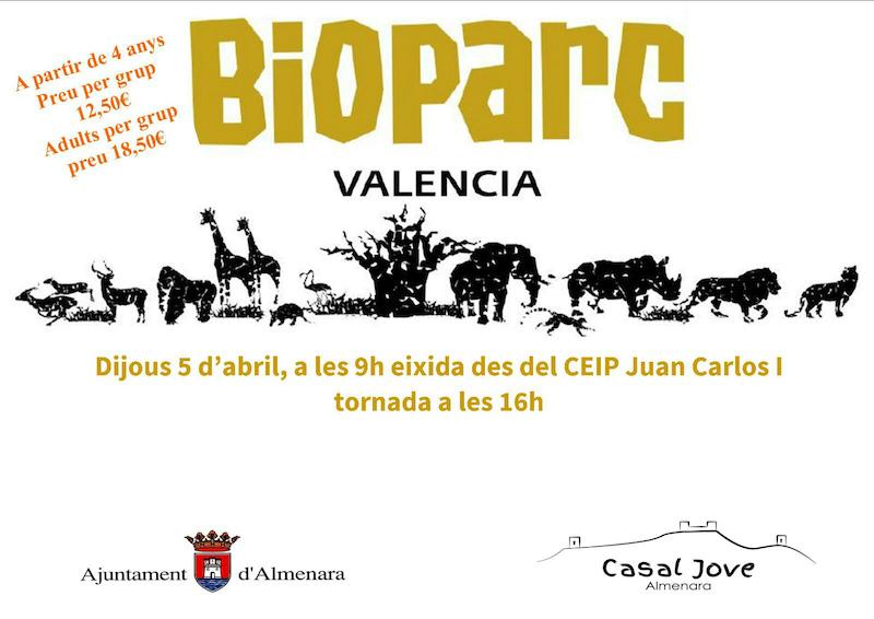 Per a la jornada del dijous 5 d'abril s'ha programat una excursió al Bioparc de València. El preu de la mateixa serà de 12,50 euros per als xiquets i xiquetes de fins a 12 anys i de 18,50 per als adults. Destacar que els menors de 4 anys no paguen. El pagament i la reserva de places per a l'excursió s'ha de realitzar el primer dia de l’Escola de Pasqua. La jornada del divendres 6 serà la gran festa de clausura que inclourà una “pequedisco” a càrrec de Rebombori cultural i un esmorzar molt especial a força de “coques”.