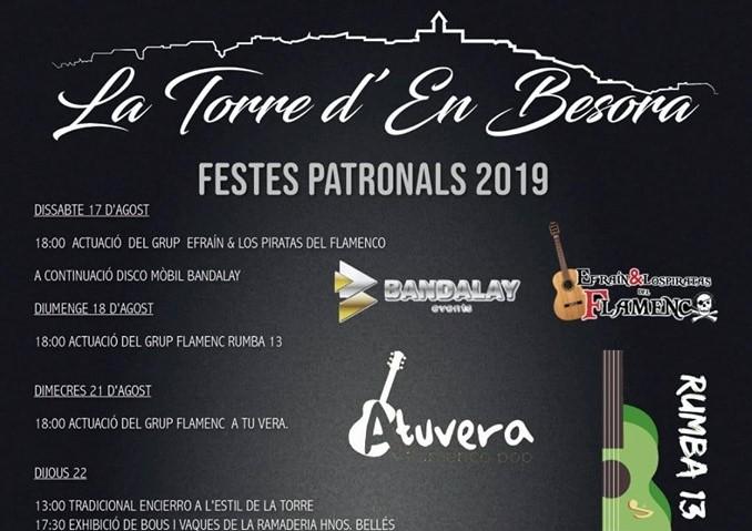 Las fiestas de la Torre d'En Besora comienzan este sábado y se alargarán hasta el día 24. De esta forma, el sábado 17 de agosto a las 18 horas actuará el grupo Efraín & Los Piratas del Flamenco a los que seguirá el baile con la discomóvil Bandalay. El domingo 18 a las 18 horas actuará el grupo flamenco Rumba 13. La fiesta continuará el miércoles 21 con la actuación de otro grupo de música flamenca, A Tu Vera.
