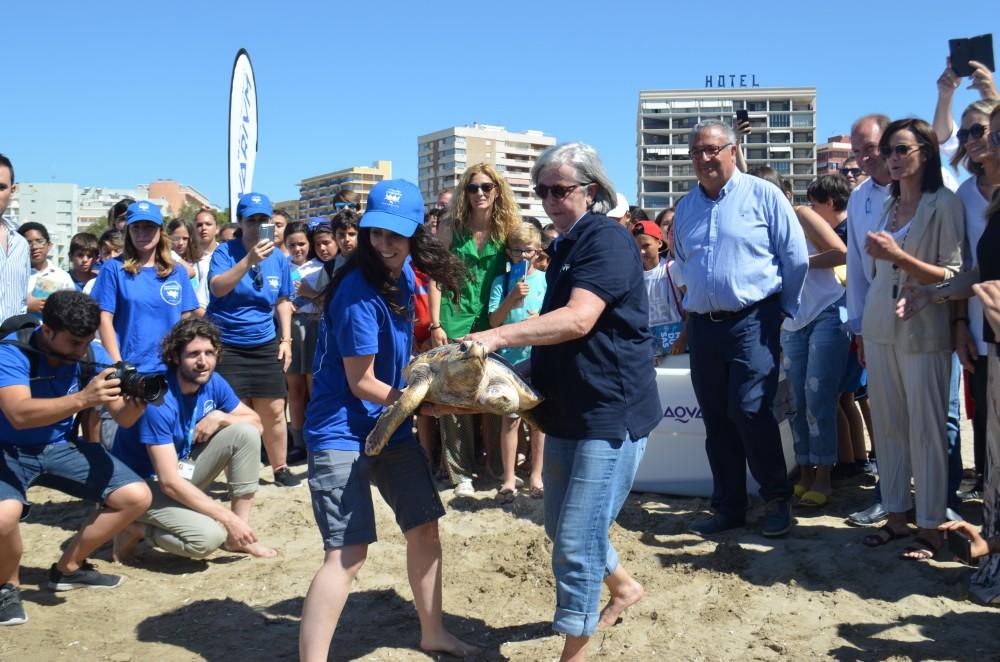 La tortuga 'Donosti', amputada de una aleta, es devuelta al mar desde La Concha de Oropesa