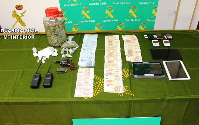 revolver calibre 22 con la numeración borrada y municionada para su uso, 7.514 euros en efectivo, tres vehículos, diverso material informático, así como instrumentos para el pesaje de la droga.
