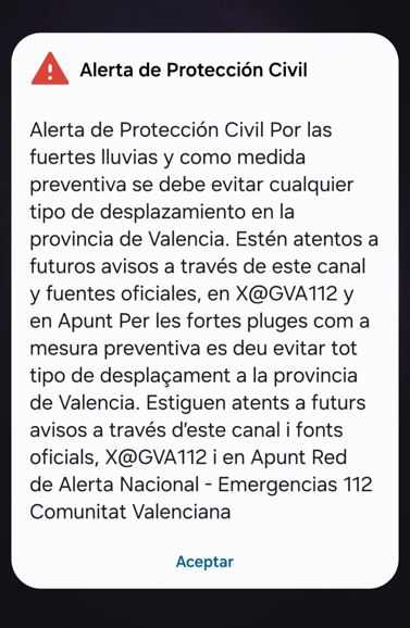 Por primera vez la Generalitat ha hecho uso de los mensajes personalizados de emergencia para pedir a los vecinos de la provincia de Valencia que no se pongan en carretera y, a ser posible que no salgan de sus casas. Además se ha pedido a los ciudadanos que viven cerca de ríos y barrancos que busquen los lugares más próximos pero más elevados, o incluso que acudan a casas de sus vecinos con varias plantas, para permanecer en alto.
